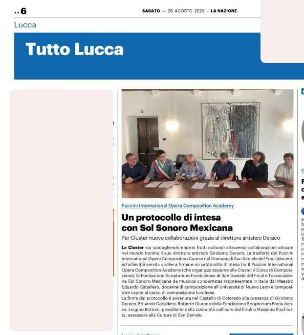 La Cluster sta raccogliendo enormi frutti culturali attraverso collaborazioni attivate nel mondo tramite il suo direttore artistico Girolamo Deraco. La trasferta del Puccini International Opera Composition Course nel Comune di San Daniele del Friuli (docenti ed allievi) è servita anche a firmare un protocollo d’intesa tra il Puccini International Opera Composition Academy (che organizza assieme alla Cluster il Corso di Composizione), la Fondazione Scriptorium Foroiuliense di San Daniele del Friuli e l’associazione Sol Sonoro Mexicana de musicos concertistas rappresentata in Italia dal Maestro Eduardo Caballero, docente di composizione all’Università di Nuevo Leon e compositore ospite al corso di composizione lucchese.