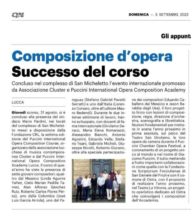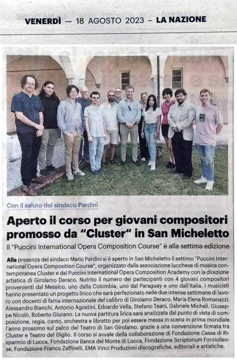 i è aperto ufficialmente questa mattina (16 agosto) il settimo Puccini international opera composition course, organizzato dalla associazione lucchese di musica contemporanea Cluster e dal Puccini International Opera Composition Academy con la direzione artistica di Girolamo Deraco.